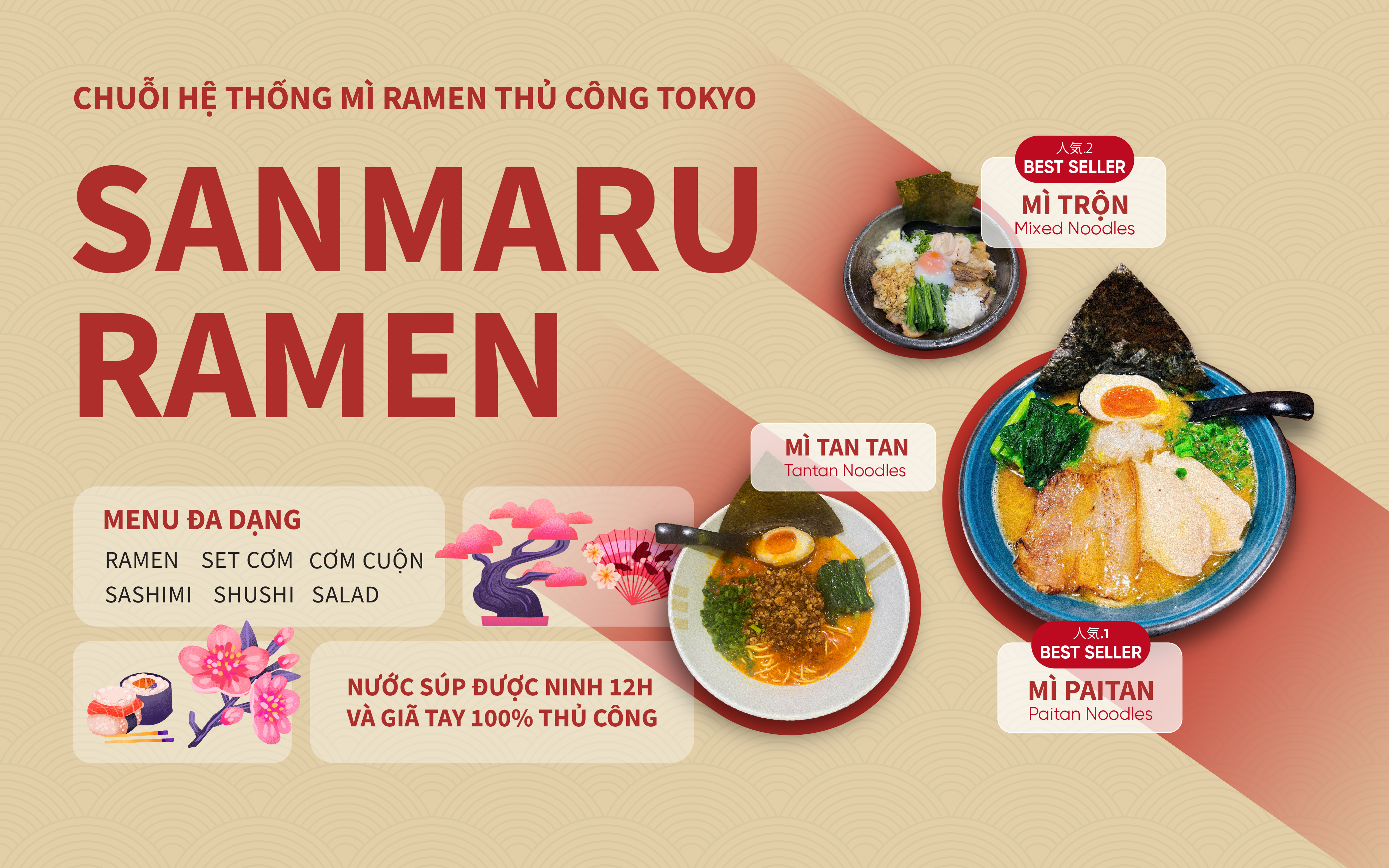 Sanmaru Ramen là chuỗi hệ thống mì Ramen thủ công Tokyo. Nước súp được ninh 12h và giã tay 100% thủ công. Nước súp đậm đà, béo ngậy chuẩn Nhật Bản .