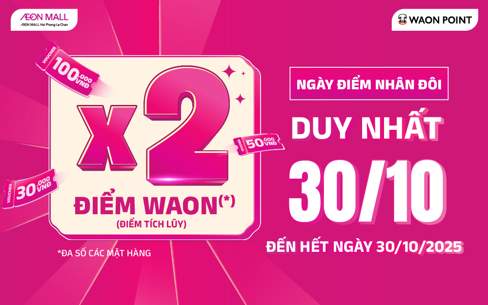 🥳 Duy nhất vào NGÀY 30 HÀNG THÁNG – TẶNG X2 ĐIỂM WAON POINT cho tất cả các khách hàng mua sắm tại AEON MALL Hải Phòng Lê Chân và tích điểm trên ứng dụng AEONMALL Việt Nam (app trắng).