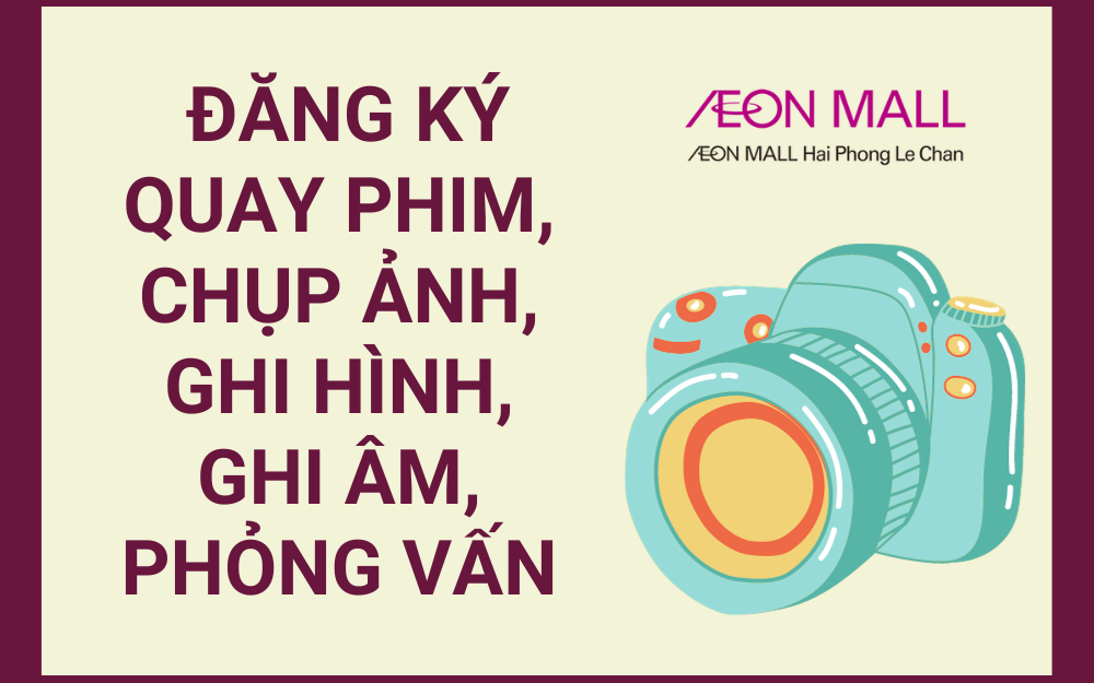 Từ ngày 04/11/2023, Ban quản lý TTTM AEON MALL Hải Phòng Lê Chân xin thông báo, Quý khách vui lòng đăng ký đơn xin cấp phép quay phim, chụp ảnh, ghi hình, ghi âm, phỏng vấn theo link online: https://forms.office.com/r/9gf2WxyEAZ